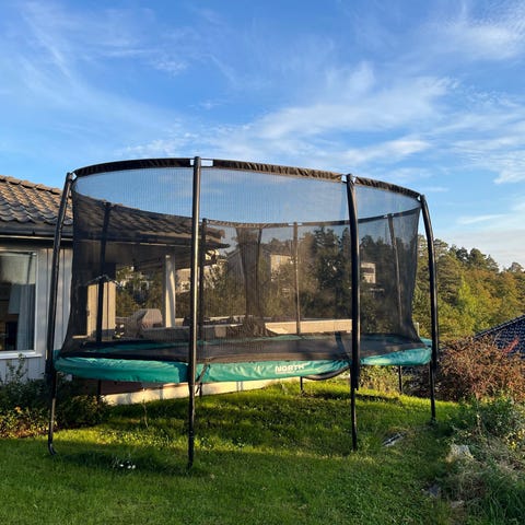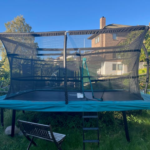 Stor trampoline av svært god kvalitet fra Jump King. Firkantet duk med suverene hoppeegenskaper. 480x340cm utvendig, 420x280cm duk. Meget solid ramme og ben. Komplett med stige, sikkerhetsnett og beskyttelsesmatter. Ekstra sett polstring til stolper, snowboard trainer medfølger. Pent brukt, ingen vesentlige skader eller manglende deler. 5 år gammel. Duk, matter, nett og fjærer lagret innendørs hver vinter.
