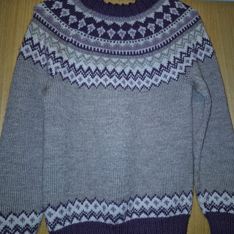 Genser størrelse S, strikket i Drops Baby Merino. Overvidde 90, lengde 65.
