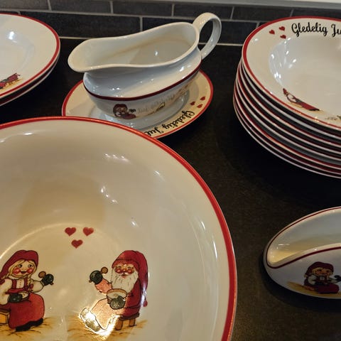 GOD JUL 35 deler tallerkener og kopper brukt 1 gang. 150kr. middag tallerken, 75kr salat/dessert tallerken og 75kr kafe/te kopper. Kjøpes helst samlet 35stk. eller 18stk. 6 av hvert.