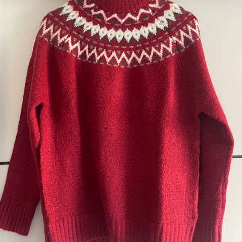 Helt ny burgunder genser i syr. L/XL kortere midel, god vidde kan brukes med skjorte under. Har 2 stk. porto på 70kr kommer i tillegg til prisen hvis den skal sendes.
