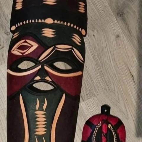 2 stk Utskårne Masker som forestiller mann og kone i hardt mørkt treverk kjøpt i Indonesia
