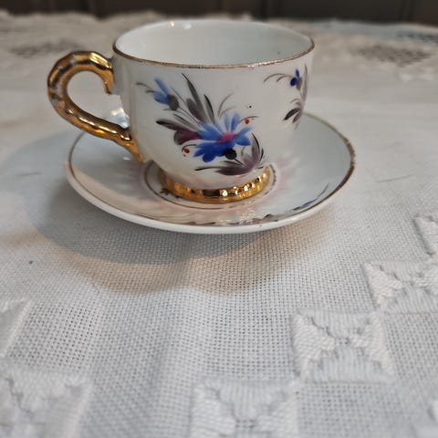 flott kuvert med mokkakopp, skål og asjett + en ekstra asjett