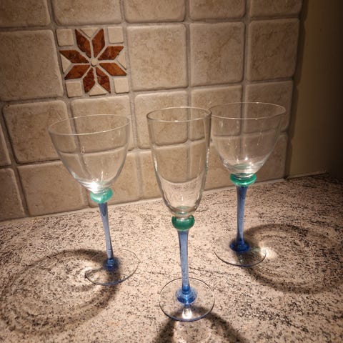 Spesielle rødvinsglass fra Magnor. 6 x 2 ulike par, men samtidig like. Farge blå/grønn - grønn/blå. Kan godt brukes sammen.