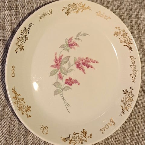 Dette fatet stammer fra ca. 1960-tallet, og kan muligens være enda eldre. Det er både et dekorativt og nostalgisk stykke norsk porselenshistorie – perfekt til kjøkken, samling eller som veggpynt.