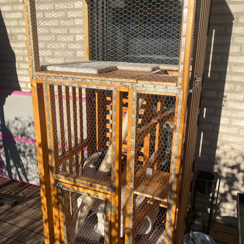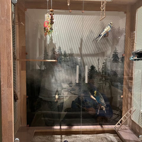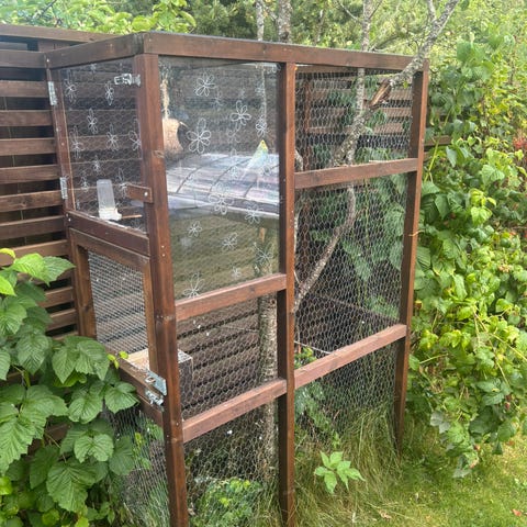 Laget et unikt og eksklusivt fuglebur av et vitrineskap i heltre eik. Glassdørene og den nedfelte skuffen lager mindre bøss på gulvet. Passer til undulater og lignende. Har hatt 4 undulater i buret. Det følger også med 2 mindre bur og masse utstyr.