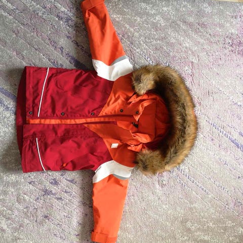 Skogstad vattert jakke, str 4 år. Marineblå med mellomblå og røde detaljer. Hette kan strammes + knappes av. Stramming i nedkant og lufting under armer. Reflekser på begge ermer.