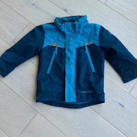 Vattert jakke og selebukse, str 3 år. Hette kan strammes + knappes av. Stramming i nedkant av jakke. Reflekser.