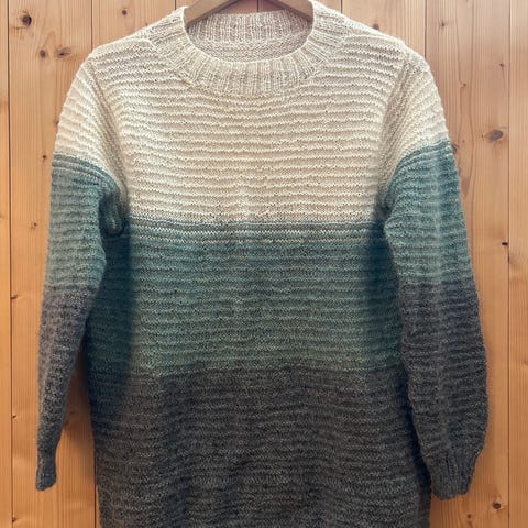 Genser størrelse XL, strikket i Viking Sportsragg. Overvidde 114, lengde 65.