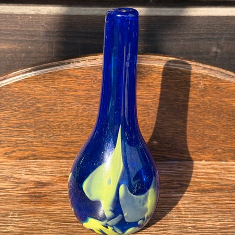 Selger denne stilige glassvasen, som dessverre aldri er blitt brukt, for jeg har for mange vaser. Den er arvegods og har en særegen form med en slags "mage" som ikke synes forfra, men se bilde 2. Høyden er 22,5 cm, bredde der den er bredest ca 15 cm, i toppen 12 cm og bunnen 6,5 cm. Dybde topp: ca 5,5 cm og på det bredeste ved "magen" rundt 10 cm.