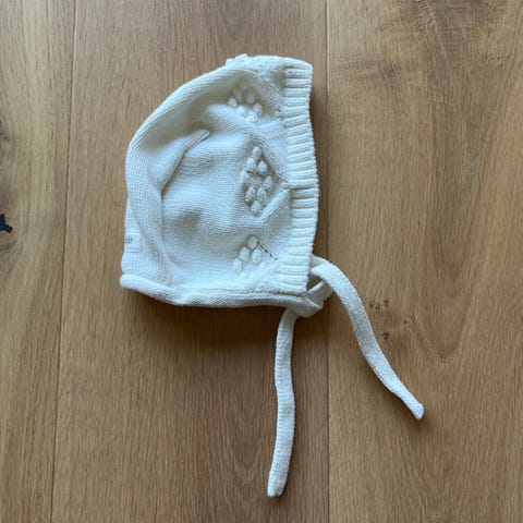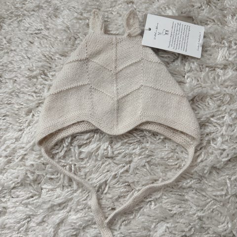 Helt ny, ubrukt, offwhite maximo vinterlue til baby med knyting i merinoull. Str 47 cm.
