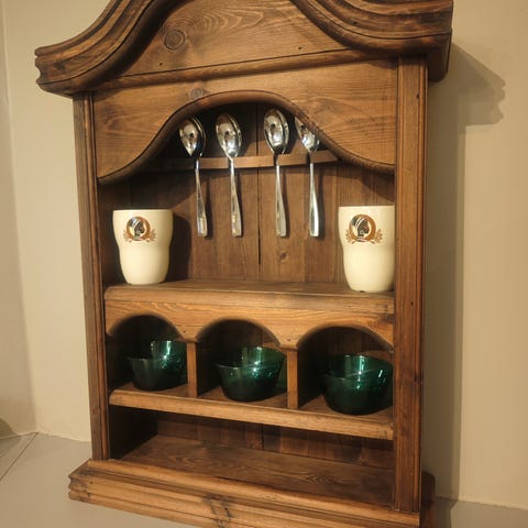 Hylle i furu med 6 knagger og stang til kleshengere (88 cm)