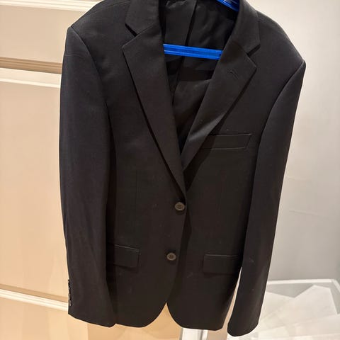 Sort dressjakke i str. 46 (short). Slim Fit modell. Blanding av 53% polyester, 45% ull og 2% lycra. Fra Dressmann. Kjøpt til gutt som gikk i 7. klasse, som var litt høyere enn gjennomsnittet