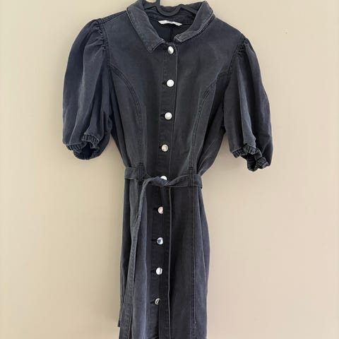 Bomullspads-poplin, med puff-erme og belte i livet. God på str.