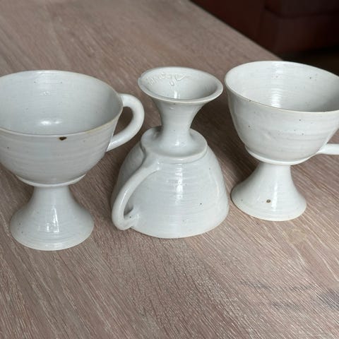 Fine lysestaker og matchende krus i keramikk. Selges samlet for kr 100,-