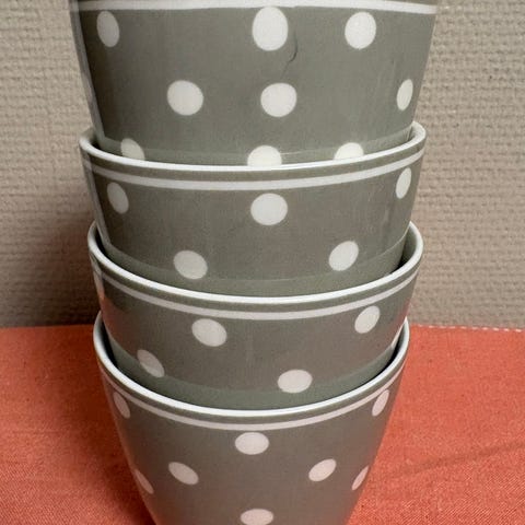 Store krus/skåler med orange prikker. Porsgrunn porselen. Høyde 8,5 cm, diameter 11 cm. I svært god stand. Selges for 100,- pr stk.