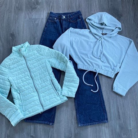 To lommer foran med glidelås, stor og god hette, regulering i kanten nederst.