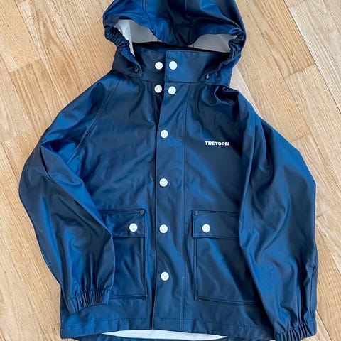 Selger omtrent ubrukt regnjakke fra TRETORN - str. 116 i farge marineblå. Denne er superfin - kul - retro og passer like fint til jente og gutt.