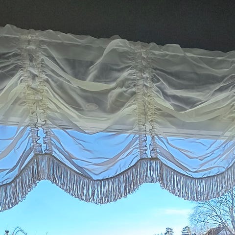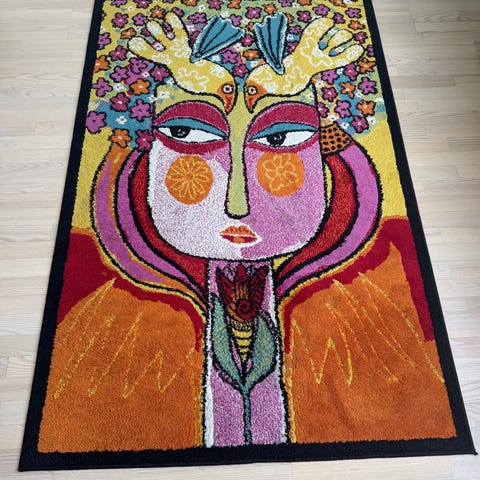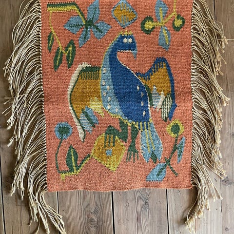 Fargerikt klede med frynser på alke sider. Sterke klare og dekorative farger. Vil egne seg oppspent i ramme eller til omsøm. Det måler 80x70 cm ex frynser.