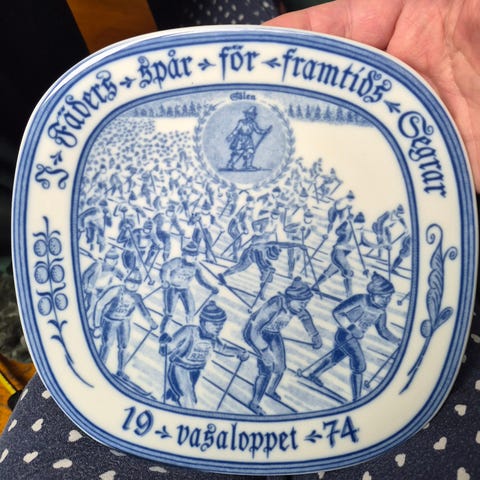 Det er hull på baksiden til oppheng, og den måler 21 cm i diameter.