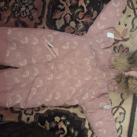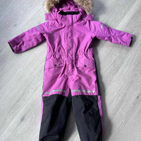 Hel og pen foret dress. Har overside som ikke slipper inn vann, foret innside og fuskepels rundt luen. Brukt litt i barnehagen. Veldig god dress syntes vi:)