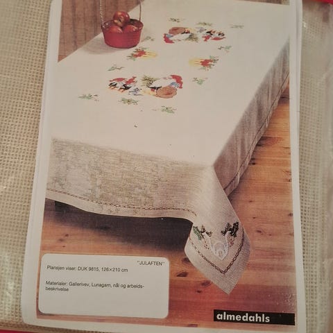 Jule dekke løperen er brodert på bomull/ lin blanding. Det er montert en gullfarget blonde på dekke løperen. SENDER GJERNE.
