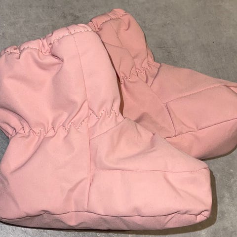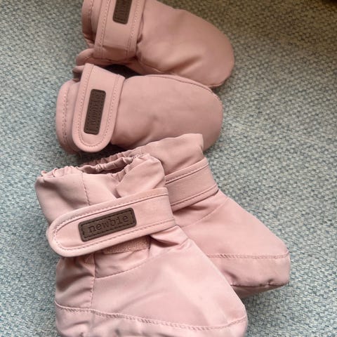Fine og varme tøfler/fotposer til babyen fra newbie. Skoene har vannavvisende materiale, mykt fleecefôr på innsiden og spenne øverst slik at passformen lett kan justeres. De er pent brukt. Str 19/20.