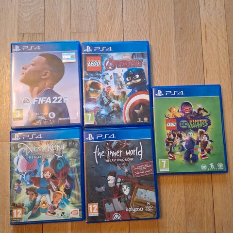 Playstation 4 spill som inkluderer fifa 21, fifa 22 og Lego marvel super hero. Brukes bare til Playstation 4