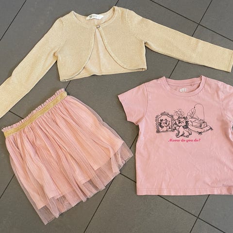 Fint sett til jente med tynn genser og rosa tyllskjørt i størrelse 98. Genseren er hvit bomull og har print av lilla ballettsko med små sløyfer på. Rund hals. Skjørtet har bred strikk i livet.