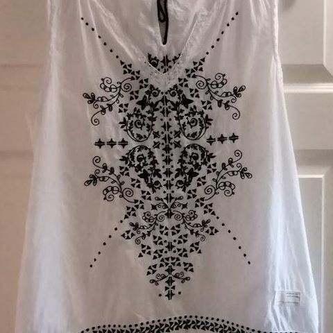 Krem/grå, tynn, lightweight, lett gjennomsiktig bluse med capsleeves, knyting i nakken og liten peplum nederst. Paisleymønster i rosa/grønt/svart. Heklet kant i hals. 100% bomull.