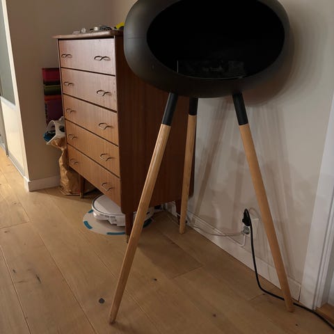 Stilig og moderne frittstående peis på hjul selges. Pent brukt, men fått en liten skade på det ene hjørnet(se bilde). Kan brukes som romdeler og flyttes på da den er på hjul.