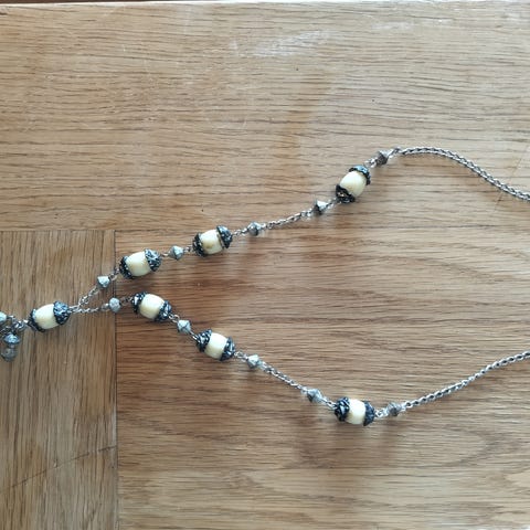Fire pene og stilige halskjeder fra Expo Arte, smykkebutikken på Solli Plass, kjent for særegne smykker! Kjedene har perler -usikker om de er ekte- tredd på en tynn vaier.