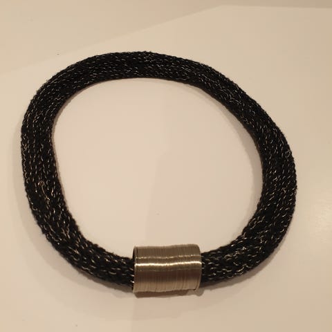 Et originalt smykke med tøysnor og lås i nakken. Mange stålringer med liten svart perle på. Kan passe både S M og L størrelse. 🦋 Kan sendes på billigste måte som brevpost