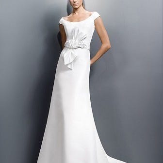 Kjolen er fra Snow by Annasul Y, modell 2986B. Den er tilpasset hos skredder hvor det er lagt til elegante avtakbare armer laget av stoff fra Dior. Armene kneppes enkelt på og kan tas av, slik at du får to ulike uttrykk i én kjole.