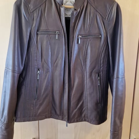 Den er i en rød rosa farge, tynt mykt skinn, har lommer og er i god stand
