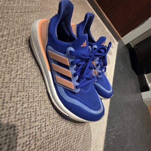 Adidas Ultraboost 21 i størrelse 44. Disse demper svært godt. Er svært lite brukt. Du kan se hvor nye og ubrukte de er på kvaliteten på stoffet. Det lille som er av grums langs skoen nede er noe som enkelt lar seg vaske av (falt meg ikke inn før jeg tok bildene).