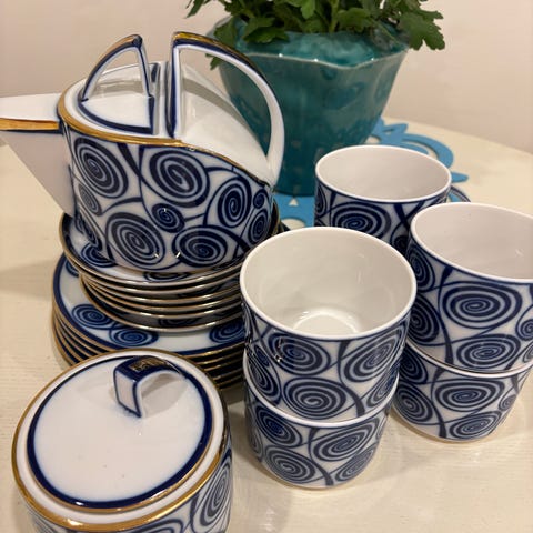 Serviset har en dyp blå dekor med gull detaljer og fremstår i svært pen stand, uten synlig bruk. Klassisk, tidløs stil som passer både samlere og deg som vil ha noe annerledes enn masseprodusert servise.