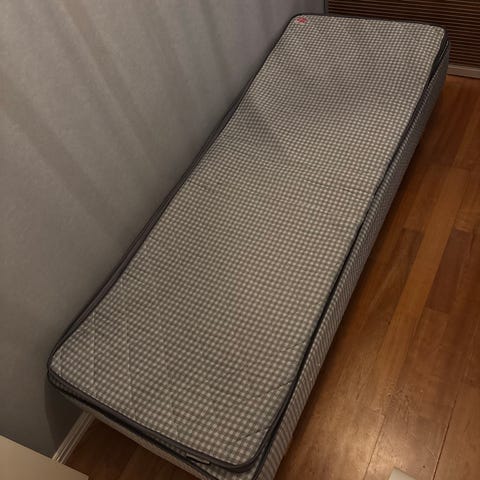 Praktisk enkeltseng med to romslige oppbevaringsskuffer. Madrass kan følge med om ønskelig, men den er litt nedslitt.