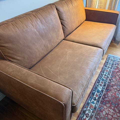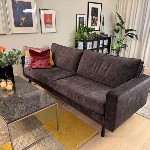 Stilren sofa i imitert skinn. Selges da jeg fikk den med leiligheten jeg har kjøpt, men har allerede min egen sofa som jeg er fornøyd med.