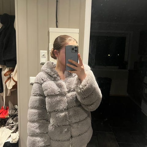 Selger denne fantastisk myke fuskepelsjakken i offwhite farge. Stor og god hette og med lengde som går midt på låret. Trykknapper og en hempe foran, stikklommer på sidene.