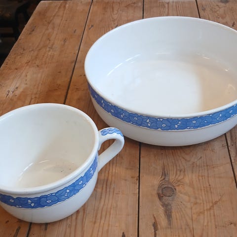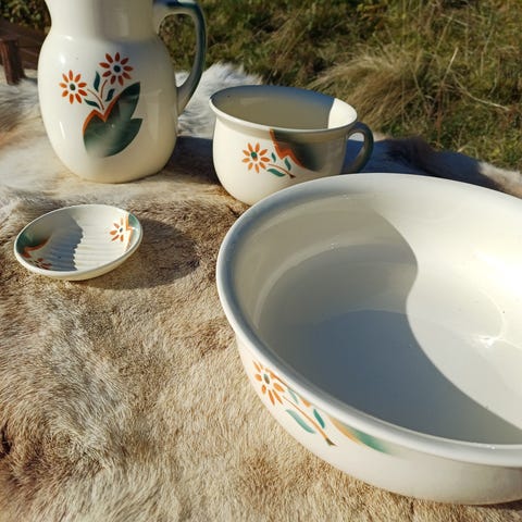 Nydelig vaskesett i 4 deler. I veldig god stand med brunt stempel! Det lille urnestemplet ble brukt i perioden 1920 - 1954 iflg Nordisk porselen sin side. Se også mine andre annonser!