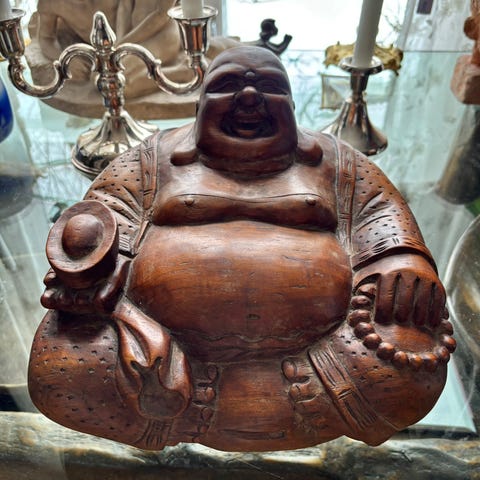 Vakker Budda i blå stein. Håndlaget. Kommet fra området "Det gylne triangel".Den er innkjøpt av meg under en reise. Høyde 7cm. Bredde 5,3 cm.