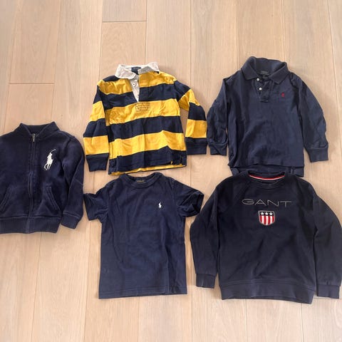 Selger pent brukte klær: collegegensere i marineblå, rød langermet trøye, én lyseblå T-skjorte, alt fra Ralph Lauren, og én mørkeblå skjorte fra Hugo Boss. Alt er i størrelse 110/116.
