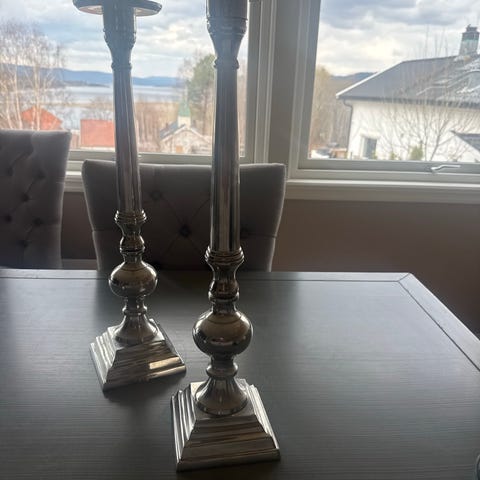 Flotte sølvfargede lysestaker 35 cm høye selges. 75kr pr stk. Må hentes.