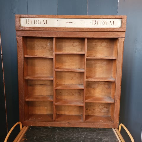 Enkel hylle i lysebrunt tre. En del bruksmerker.