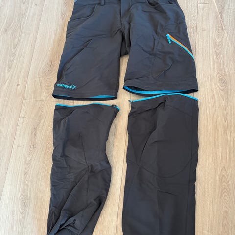 Lett og elastisk turbukse med justering i liv/bein, samt luftespalter i sidene. Veldig god, men dessverre for liten! En liten str M, evt S, vil jeg si. Fargen er grå.