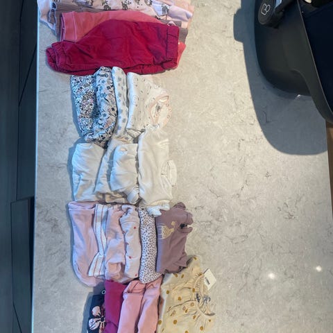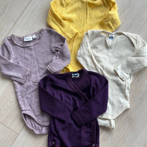 Klespakke fra hust & claire i størrelse 62 selges for 400,- kroner. Inneholder en finstrikket heldress, denne er kun tatt av lappen på, en pysj i ull og silke fra hust & claire, en romper også hust & claire, og en ribbestrikket body fra nameit.