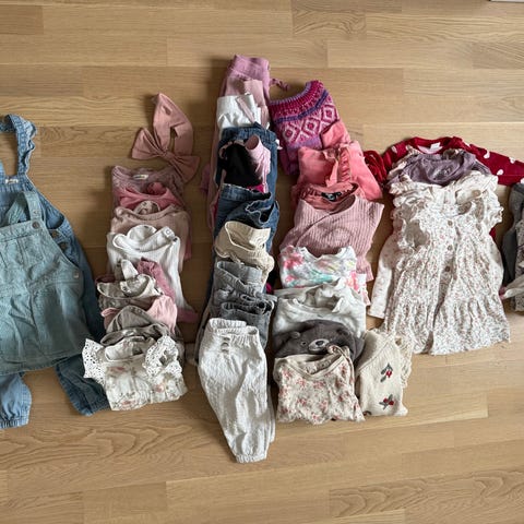 Pent brukte klær i str 62 og noen er ubrukte klær. Ingen anmerkninger utenom i pysj som har litt flekker (se bilde) også er det en ulljakke som er str 68, men krympet litt i vask.