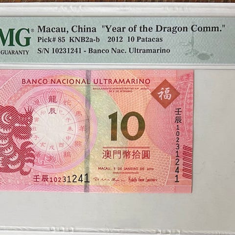Banco Nacional Ultramarino Macau seddel med pålydende verdi 10 pataca. Seddelen har motiv av moderne bygning på den ene siden og tekst «Banco Nacional Ultramarino» samt «Macau» på den andre. Egner seg som samleobjekt for numismatikere eller som eksempel på moderne valuta fra Macau.