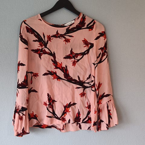 Nydelig florlett bluse med volanger, i en varm delikat rødfarge. Åpning i nakken, og en "underkjole/topp" isydd blusen. Pent brukt, ingen bruksmerker.