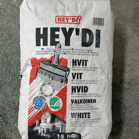 Hey'di lett rep 9 sekker på 10kg. 190kr pr sekk. Er reprasjon og sparkelmasse. Kan benyttes på alle underlag, mur, betong, tre, gips. Å på vegg,gulv og tak. Gir godt skru og spikerfeste.